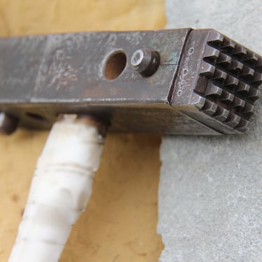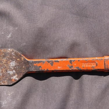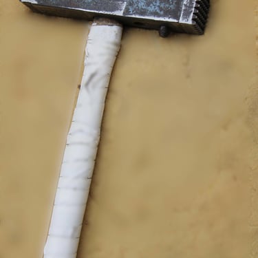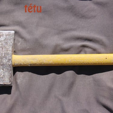 En haut, un marteau, au milieu un ciseau, à droite un tétu. En bas et à gauche une Boucharde. Le kakemono de grande taille en haut à gauche montre l'équipe et quelques chantiers