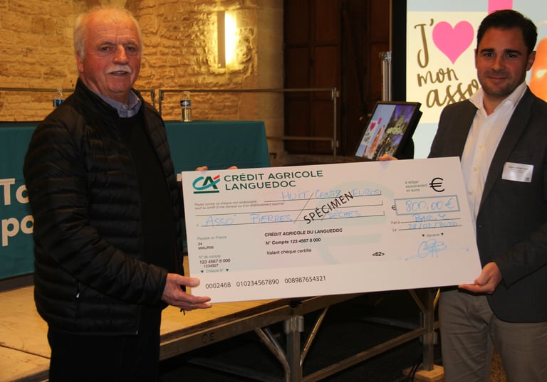 Notre président et fondateur, Bernard Raoux, reçoit un chèque de 800€ du Crédit Agricole. Nous avons participé au concours 'J'aime mon asso' organisé par la banque et gagné un prix. Lors de la cérémonie, Bernard Raoux a rappelé les objectifs de l'association et la participation de tous ses membres