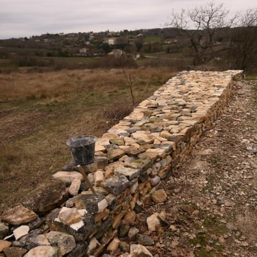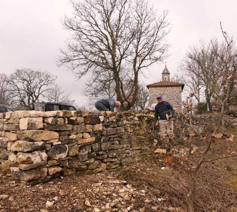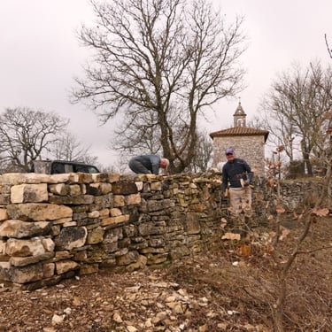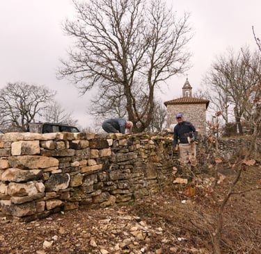 C'est la seconde fois, en 2025, que nous retournons à la chapelle St Sébastien, à St Privat. Nous y avions revu la murette le long du clapas devant l'entrée de la chapelle. Cette fois, nous travaillons sur le mur qui sépare le chemin d'accès du pré situé au nord.