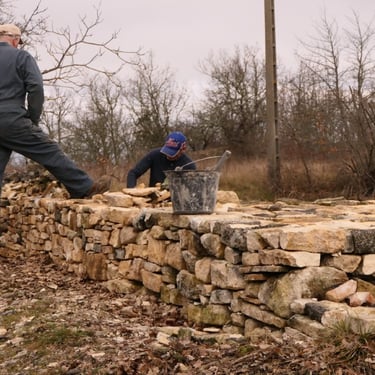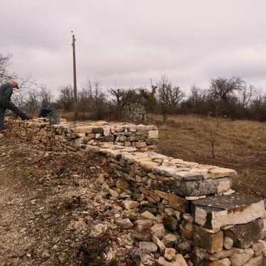 Coupe des arbres, démontage du mur, remontage. La particularité est l'épaisseur de l'ensemble, qui sert de muret et de stockage de pierres.
